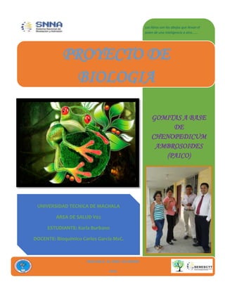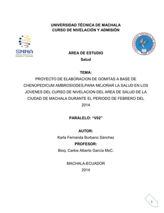 Este documento presenta un proyecto de elaboración de gomitas a base de Chenopodium ambrosioides (paico) para mejorar la salud de jóvenes en Machala, Ecuador. Explica los antecedentes de la problemática de salud de los jóvenes, el objetivo de elaborar gomitas nutritivas y saludables, y el marco teórico, metodología y resultados del proyecto.
