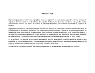 Este documento presenta un proyecto de secuencia didáctica sobre el tema de "Mitos y leyendas" para alumnos de primer grado de secundaria. El proyecto consta de 8 sesiones que utilizarán recursos tecnológicos como computadoras, internet y cañón para analizar diferentes materiales literarios sobre mitos y leyendas regionales y desarrollar microproyectos colaborativos sobre el tema.