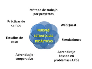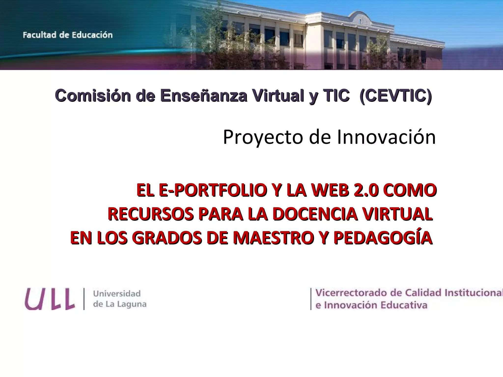 El proyecto busca innovar en la docencia virtual mediante el uso de e-portfolios y recursos Web 2.0 en los grados de maestro y pedagogía. Se proponen acciones como la formación del profesorado en tecnologías del aprendizaje, la implementación de un software de e-portafolio y la recolección de opiniones para mejorar la formación. El objetivo es mejorar la calidad docente y desarrollar las competencias de los estudiantes en el contexto académico actual.