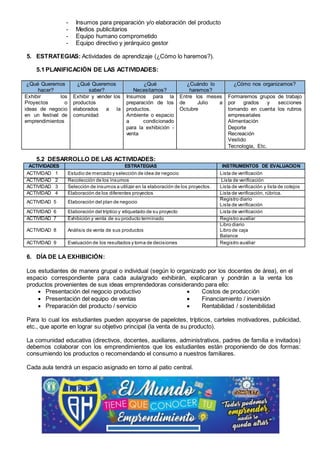 Este documento presenta un proyecto de área de Educación para el Trabajo en la Institución Educativa Pública “Bartolomé Herrera” que tiene como objetivo fomentar ideas emprendedoras entre estudiantes de 1o a 5o grado de secundaria. El proyecto involucra la elaboración de planes de negocio por parte de los estudiantes organizados en grupos. Las actividades propuestas incluyen estudios de mercado, recolección de insumos, elaboración de productos, planes de negocio y la exhibición final de los product