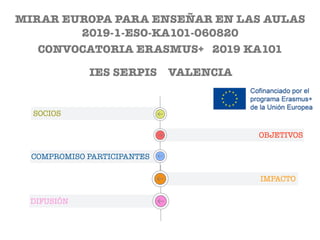 Este documento describe un proyecto Erasmus+ titulado "Mirar Europa para enseñar en las aulas" llevado a cabo por el IES Serpis en Valencia, España. El proyecto involucra la movilidad de docentes a países socios como Francia, Grecia, Italia, Polonia y Rumania con el objetivo de mejorar las competencias lingüísticas y el conocimiento de otras culturas, y introducir nuevas metodologías de enseñanza en las aulas. El proyecto también busca mejorar la gestión escolar y foment