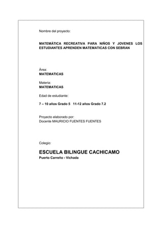 Este documento describe un proyecto para enseñar matemáticas de manera recreativa a niños y jóvenes entre 7-12 años utilizando el programa Sebran's ABC. El programa incluye juegos para enseñar letras, números, sumas, restas y multiplicaciones. Los estudiantes realizaron ejercicios de multiplicación en el programa y el 75% los completó correctamente. El documento concluye que Sebran ofrece una oportunidad educativa divertida para aprender conceptos básicos.