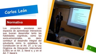 Los proyectos escolares buscan desarrollar habilidades cognitivas y socioemocionales de los estudiantes para contribuir a su desarrollo integral, de acuerdo a la constitución y leyes de educación. Los proyectos se enfocan en obtener un producto interdisciplinario relacionado a los intereses de los estudiantes a través de un enfoque científico. Los facilitadores de los proyectos deben tener conocimientos y experiencia en el campo científico así como en el trabajo con niños y adolescentes.
