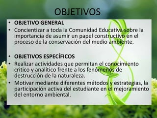 Este documento presenta un proyecto educativo ambiental para una institución educativa. El objetivo general es concientizar a la comunidad educativa sobre la importancia de conservar el medio ambiente. Las actividades propuestas incluyen la siembra de hortalizas orgánicas, campañas de reciclaje y elaboración de periódicos murales ecológicos. El proyecto busca que los estudiantes asuman responsabilidades para proteger el medio ambiente a través de experiencias prácticas.