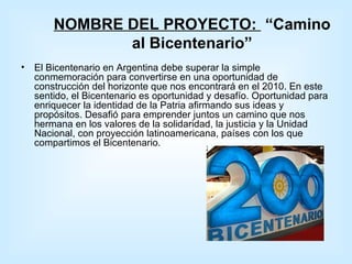 El proyecto escolar 'Camino al Bicentenario' busca utilizar la conmemoración del bicentenario argentino como una oportunidad para fortalecer la identidad nacional y promover valores como la solidaridad, la justicia y la unidad. Se enfoca en la formación ética y en el desarrollo de competencias en lectura y escritura, integrando contenidos relevantes en la planificación educativa. Además, plantea un enfoque colaborativo que incluye la participación de la comunidad y un compromiso hacia la mejora continua del servicio educativo.