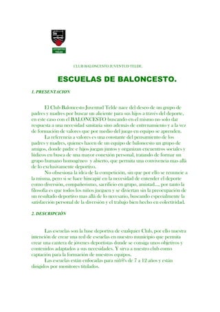 El documento describe las escuelas de baloncesto del Club Baloncesto Juventud Telde. Las escuelas están dirigidas a niños de 7 a 12 años y tienen como objetivos desarrollar la personalidad de los niños, fomentar la amistad y cooperación a través del deporte, y mejorar sus habilidades técnicas y físicas. Los entrenamientos se llevan a cabo dos o tres veces por semana y también incluyen competiciones entre las diferentes escuelas del club.