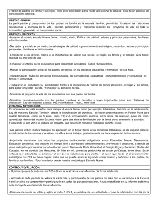 La Escuela Familiar en la Institución Educativa Maltería se ha implementado desde 2011 para fortalecer las relaciones entre padres, estudiantes y docentes. El objetivo es mejorar las competencias comportamentales de los estudiantes mediante la participación activa de los padres. Se realizan diversas actividades como talleres y celebraciones del Día de la Familia para lograr esta meta.