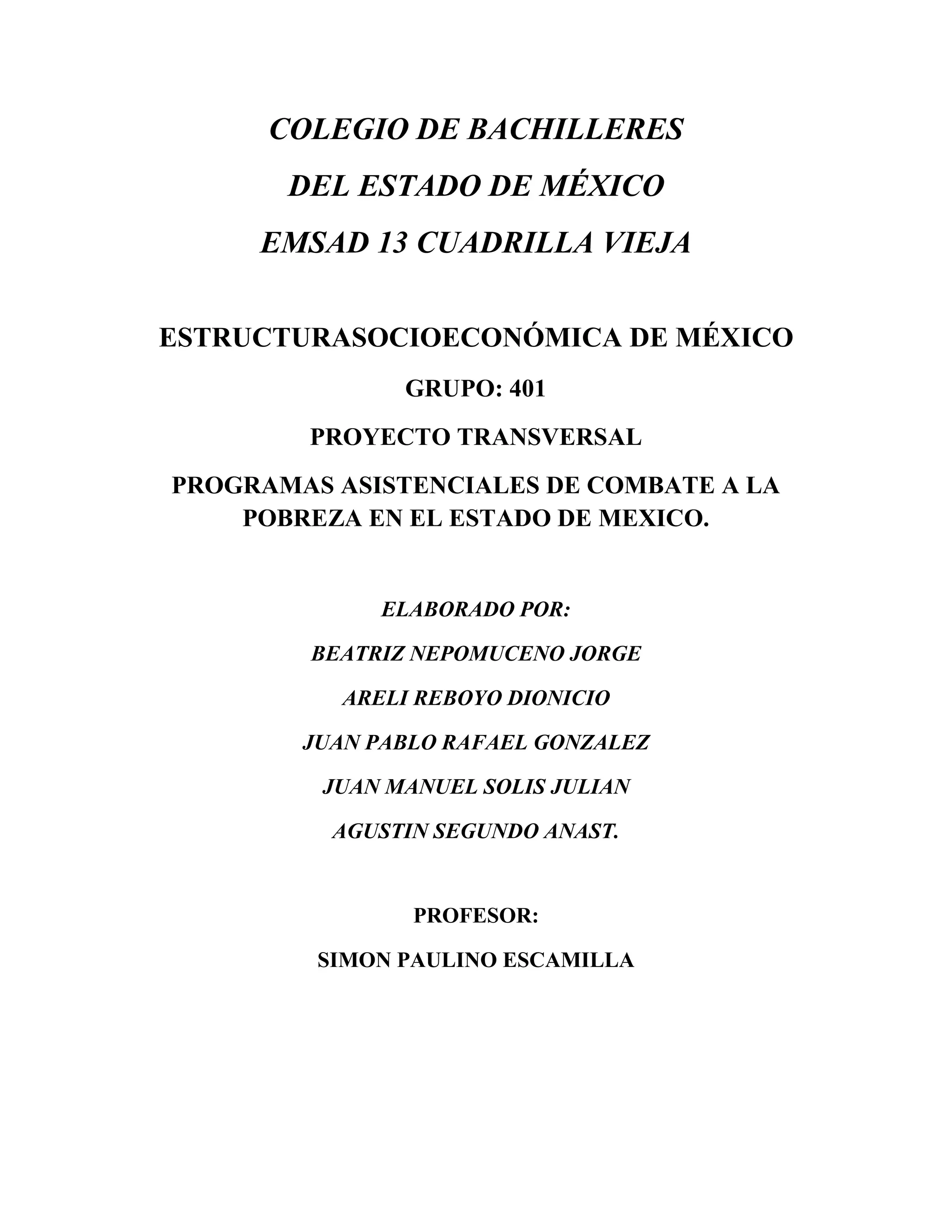 Este documento describe varios programas de asistencia implementados por el gobierno de México para combatir la pobreza en el estado de México, incluyendo programas de canastas alimentarias, útiles escolares y apoyo económico para niños indígenas, adultos mayores de 70 años y personas en situación de pobreza. También describe programas como "Apadrina a un niño indígena", "Seguridad alimentaria", "70 y más", "3x1 para migrantes" y esfuerzos para garantizar la calidad y nutrición de los