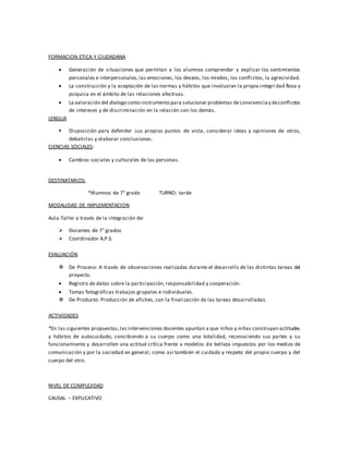 Este documento presenta una propuesta de Educación Sexual Integral (ESI) para alumnos de 7° grado. Los objetivos incluyen promover el autocuidado y el respeto por uno mismo y los demás. Se abordan contenidos de ciencias naturales, formación ética y ciudadana y lengua, incluyendo el reconocimiento del cuerpo, la pubertad, la salud sexual y las relaciones interpersonales. Se proponen actividades como debates, videos y afiches para tratar estos temas de manera integrada y despejar dudas sobre la sexualidad.