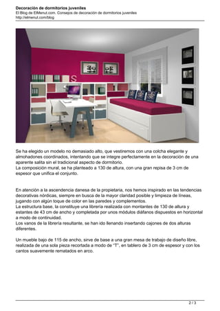 Este documento describe la decoración de una habitación que servirá tanto como espacio de trabajo como dormitorio de invitados. Se eligió un estilo nórdico limpio y minimalista, con una cama compacta deslizante, una gran mesa de trabajo y estantes que almacenan libros y objetos. El objetivo era crear un espacio funcional y versátil para una familia mixta.