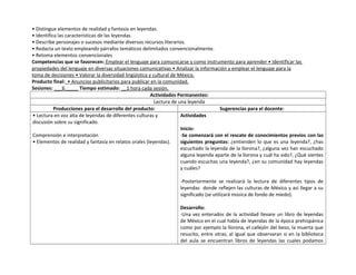 Este documento presenta la planeación didáctica para una unidad sobre leyendas en español para estudiantes de quinto grado. La unidad se enfocará en identificar las características de las leyendas, describir personajes usando recursos literarios, y elaborar anuncios publicitarios basados en leyendas de la comunidad. Las sesiones incluirán lectura de leyendas, discusión de elementos de fantasía y realidad, recopilación de leyendas orales, y creación de un compendio de leyendas con portada e índice.
