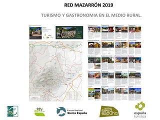 El documento proporciona información sobre el turismo y la gastronomía en la zona rural de Sierra Espuña en Murcia. Presenta una lista de 20 establecimientos hoteleros, de restauración y actividades ecoturísticas en la zona, incluyendo detalles sobre sus servicios y contactos. La asociación de empresarios turísticos de la zona promueve el desarrollo sostenible del turismo rural basado en la gastronomía local y actividades de ocio respetuosas con el medio ambiente.