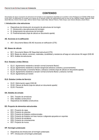 Este documento proporciona orientación para el anteproyecto de una estructura de hormigón para un edificio. Presenta diferentes tipologías estructurales según el número de plantas, e incluye recomendaciones para edificios convencionales de hasta 10 plantas con pórticos y forjados unidireccionales, como elegir luces entre 4-6 metros, valores mínimos de canto para vigas y losas, y consideraciones sobre pórticos, vigas y soportes. También presenta tablas con valores de referencia para el canto