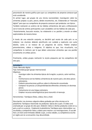 Este documento describe un proyecto de cocina internacional para estudiantes de 9-10 años que aprenderán sobre la gastronomía y hábitos alimenticios de su propio país y de otro país. Los estudiantes investigarán productos alimenticios típicos, crearán un "mercado digital", presentarán recetas tradicionales en video, y finalmente cocinarán una receta seleccionada del otro país. El proyecto utilizará herramientas digitales como TwinSpace para la colaboración entre países y tendrá una degustación final para compart
