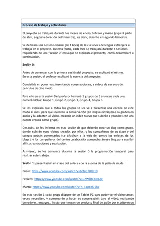Este documento describe un proyecto para que estudiantes de 6o grado pongan voz en inglés a escenas de películas mudas. Los estudiantes serán divididos en grupos para crear guiones, grabar audio e integrarlo a videos. Los videos serán publicados en blogs para recibir comentarios de compañeros y de un colegio colaborador. El proyecto durará tres meses, con una sesión semanal. Los estudiantes evaluarán los videos del otro colegio y recibirán una calificación. Si el proyecto tiene éx