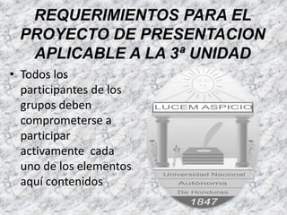 Este documento presenta los requerimientos para un proyecto de investigación en grupos sobre temas de computación para administración de empresas. Los estudiantes se dividirán en 6 grupos y cada grupo investigará un tema diferente como herramientas de software de administración de proyectos, sistemas de apoyo a la toma de decisiones o comercio electrónico. Cada grupo deberá presentar sus hallazgos en una presentación de PowerPoint de 2 horas y entregar un informe final con la investigación, presentación y referencias. El proyecto representa el 70%