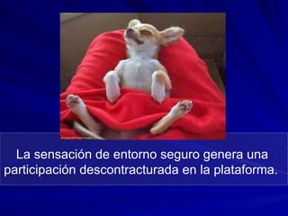 Este documento discute cómo la sensación de seguridad en Facebook genera una participación despreocupada en la plataforma a pesar de que las reglas de participación rara vez se leen y la participación real se define más por normas sociales implícitas que por las políticas establecidas. También explora cómo la arquitectura y diseño de Facebook influyen en la forma en que las personas participan.