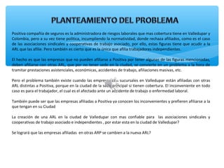 El documento analiza la factibilidad de crear una empresa de seguros en riesgos laborales en Valledupar debido a la falta de opciones confiables para afiliados, principalmente sindicatos y trabajadores independientes. Se destaca la importancia de mejorar la cobertura y la atención en gestión de riesgos laborales, aprovechando el nuevo marco normativo y buscando la sostenibilidad del proyecto a través de diversas evaluaciones técnicas y financieras. Se concluye que la creación de esta administradora podría facilitar el acceso a servicios y mejorar la salud ocupacional en la región.