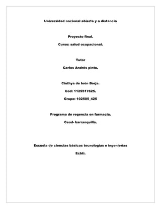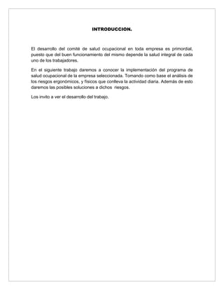 Este documento describe el programa de salud ocupacional de la empresa Medi-hos Ltda. En primer lugar, identifica los factores de riesgo ergonómicos como posiciones prolongadas sentado y de pie, y micromovimientos repetitivos de manos. Luego, propone intervenciones como dotar de sillas ergonómicas, apoya-muñecas, capacitar en higiene postural y pausas activas, e instalar programas de pausas. Finalmente, responsabiliza al personal directivo de implementar el programa y elaborar un cronograma de actividades