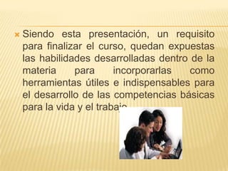 Este documento describe un proyecto realizado como requisito para finalizar un curso de Tecnología de la Información. El proyecto involucra la creación de un pequeño negocio familiar de venta de quequitos para analizar la perspectiva de los pequeños emprendedores como solución a la crisis económica. El autor describe la inversión inicial, los posibles puntos de venta, la ganancia proyectada de $150 diarios, y concluye que aunque los pequeños negocios enfrentan muchas dificultades, pueden ser una alternativa ante
