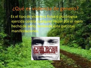 Este documento describe la violencia de género, incluyendo tres tipos (física, psicológica y sexual), y proporciona estadísticas sobre el maltrato físico y psicológico de las mujeres. También menciona que para reducir la violencia de género, se necesita cambiar las normas y valores que la toleran y fomentan, así como actitudes sexistas.