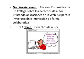 Este documento describe un curso sobre derechos de autor que utiliza aplicaciones de la Web 2.0 como Facebook y Glogster. Los estudiantes investigarán sobre derechos de autor en grupos y crearán un collage en Glogster. Luego publicarán su collage en Facebook para recibir comentarios y discutir la importancia de los derechos de autor en la educación.