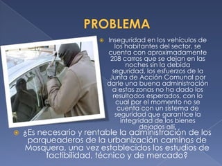 La administración de los parqueaderos de la urbanización Caminos de Mosquera es viable según los estudios de factibilidad, técnico y de mercado realizados. Actualmente 208 residentes dejan sus vehículos expuestos a robos por falta de seguridad. El proyecto garantizaría la seguridad de los vehículos, mejoraría la organización de los parqueaderos y ofrecería un precio competitivo que brindaría tranquilidad a los residentes.