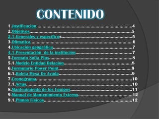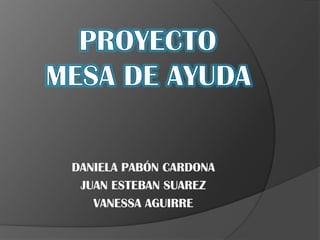 La mesa de ayuda de la Institución Educativa Rosalía Suarez presenta los métodos aprendidos para dar solución a problemas de software y hardware. Se elaboró un cronograma y formatos en Sofía Plus y Power Point para registrar las actividades. También se creó un inventario, manuales y planos para el mantenimiento de equipos y la sala de computo, mostrando la ubicación de la institución. Todo está documentado en un blog con fotos que evidencian el trabajo realizado.