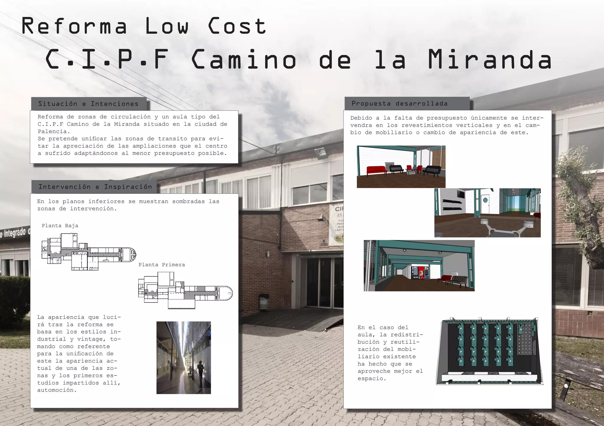 Este documento describe una propuesta de reforma de bajo costo para el C.I.P.F Camino de la Miranda en Palencia, España. La reforma pretende unificar las zonas de tránsito del centro para evitar ampliaciones costosas, adaptándose al presupuesto mínimo. La intervención se centrará en los revestimientos verticales y el mobiliario, dándole un estilo industrial y vintage inspirado en la automoción.