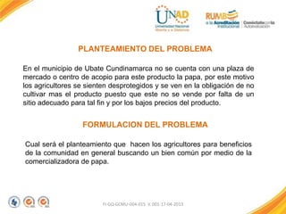 Este proyecto propone la construcción y operación de un pabellón de comercialización de papa en el municipio de Villa de San Diego de Ubaté, Cundinamarca. Actualmente los agricultores de la región no cuentan con un lugar adecuado para vender su cosecha de papa, lo que les causa problemas económicos. El proyecto busca beneficiar tanto a los agricultores como a los consumidores ofreciendo un producto de alta calidad a un precio justo. El pabellón tendría una construcción de 600 metros cu