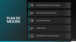 Este documento presenta un plan de mejora para el sistema de información de una empresa. Propone mejoras en tres áreas: acceso a la información, planificación de estrategias y análisis de información. Las acciones incluyen incorporar acceso móvil, herramientas de comunicación y planificación de proyectos, y una plataforma de business intelligence. El plan describe objetivos, acciones específicas, planificación e implementación, y métricas de seguimiento para garantizar que las mejoras logren sus metas de mejorar la toma de decisiones.