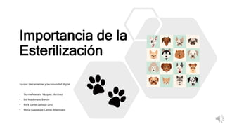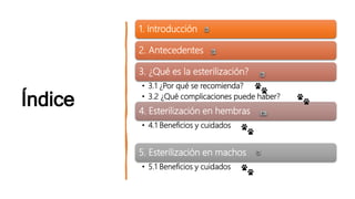 La esterilización es un procedimiento quirúrgico para evitar la reproducción al retirar los ovarios o testículos. Se recomienda para controlar la sobrepoblación de animales callejeros y abandonados, mejorar la salud de las mascotas, y prevenir el maltrato. Las hembras pueden someterse a ligadura de trompas, ovariectomía u histerectomía, mientras que los machos a vasectomía u orquiectomía. Tras la cirugía, las mascotas deben recibir cuidados como analg