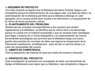 Este proyecto busca implementar una página web, automatizar y crear una base de datos para las colecciones de la Biblioteca del barrio Oriental para que pueda ofrecer un mejor servicio a sus usuarios. Actualmente la biblioteca tiene un fondo bibliográfico desactualizado y carece de herramientas tecnológicas. El proyecto permitirá dotar a la biblioteca de recursos actualizados a través de donaciones y dar acceso a la información de forma eficiente mediante las nuevas tecnologías.
