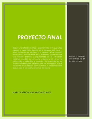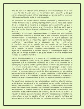El documento presenta una reflexión sobre la educación y el rol de las tecnologías de la información y la comunicación (TIC) en los procesos educativos. Argumenta que la sociedad ha pasado a ser una sociedad del conocimiento debido a los avances tecnológicos, pero que la escuela aún no ha logrado integrar plenamente las TIC. También señala que el rol del docente ha evolucionado para ser un facilitador del aprendizaje de los estudiantes mediante el uso de las herramientas tecnológicas. Finalmente, resalta