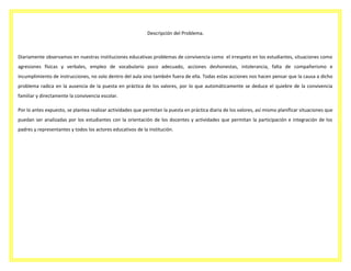 Este documento describe un proyecto para fortalecer la convivencia escolar y familiar en estudiantes de cuarto grado en Venezuela. El proyecto se llevará a cabo en la Escuela Básica Rafael Antonio Godoy durante 12 semanas e incluirá actividades sobre valores, comunicación, respeto y convivencia. Los objetivos son desarrollar conceptos sobre la convivencia, generar procesos reflexivos, fortalecer la familia y promover la participación de los padres.
