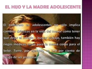 El documento trata sobre el embarazo precoz en las adolescentes. Resume que el embarazo precoz se define como aquel que ocurre en adolescentes menores de 19 años, y puede deberse a factores como falta de comunicación con los padres, inicio temprano de relaciones sexuales, o abuso sexual. Algunas consecuencias comunes son el aborto espontáneo o terapéutico, así como dificultades para la madre y el hijo adolescente.