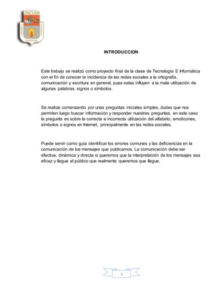 Este documento presenta un proyecto final sobre las competencias comunicativas en las redes sociales. El proyecto explora cómo las redes sociales influyen en la ortografía, comunicación y escritura, y cómo se pueden mejorar estas habilidades. El autor concluye que aunque las redes sociales permiten nuevas formas de expresión, es importante mantener una buena ortografía para comunicarse de manera efectiva y evitar malentendidos.