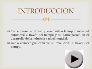 El documento resume la historia del automóvil desde su creación en 1885 hasta el presente. Explica que el primer automóvil con motor de combustión interna fue creado por Karl Benz en 1885 en Alemania. En 1908, Henry Ford comenzó a producir automóviles en cadena de montaje, lo que permitió una producción masiva. El automóvil se ha vuelto el principal medio de transporte y ha evolucionado para ser más seguro, eficiente y menos contaminante a lo largo de los años.