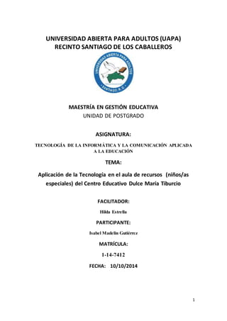 Este documento presenta un proyecto para implementar herramientas tecnológicas como computadoras, pantallas digitales e internet en un aula de recursos para niños con necesidades especiales con el fin de mejorar sus aprendizajes y hacerlos más atractivos. El proyecto incluye conectar el aula a internet, gestionar los recursos financieros y capacitar al personal del aula en el uso de la tecnología. El objetivo general es instalar estas herramientas tecnológicas para mejorar la enseñanza de estos estudiantes