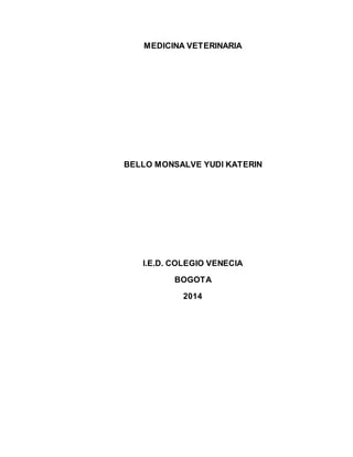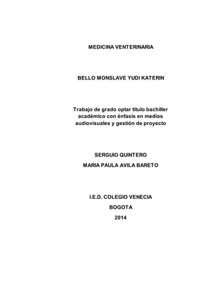Este documento presenta un proyecto de grado sobre medicina veterinaria realizado por Yudi Katerin Bello Monsalve para optar por el título de bachiller académico con énfasis en medios audiovisuales y gestión de proyectos en el Colegio Venecia I.E.D. de Bogotá. El proyecto busca concientizar a los estudiantes y docentes sobre el maltrato animal a través de charlas y actividades en el colegio durante un periodo de 5 meses.