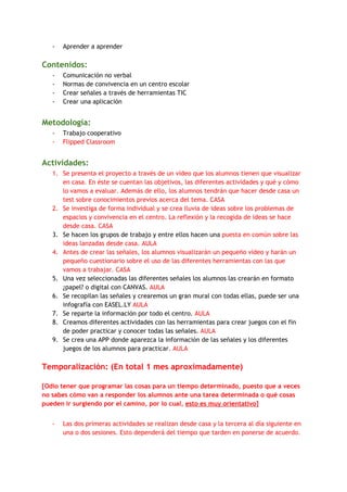 El documento describe un proyecto escolar para crear señales de convivencia en un colegio debido al gran número de alumnos. El objetivo es que los alumnos creen las señales y luego desarrollen una aplicación móvil con información sobre las señales y juegos interactivos para practicarlas. El proyecto abarcará diferentes áreas como lengua, inglés y artes a lo largo de varias sesiones utilizando herramientas digitales como Canva, Padlet y otras.