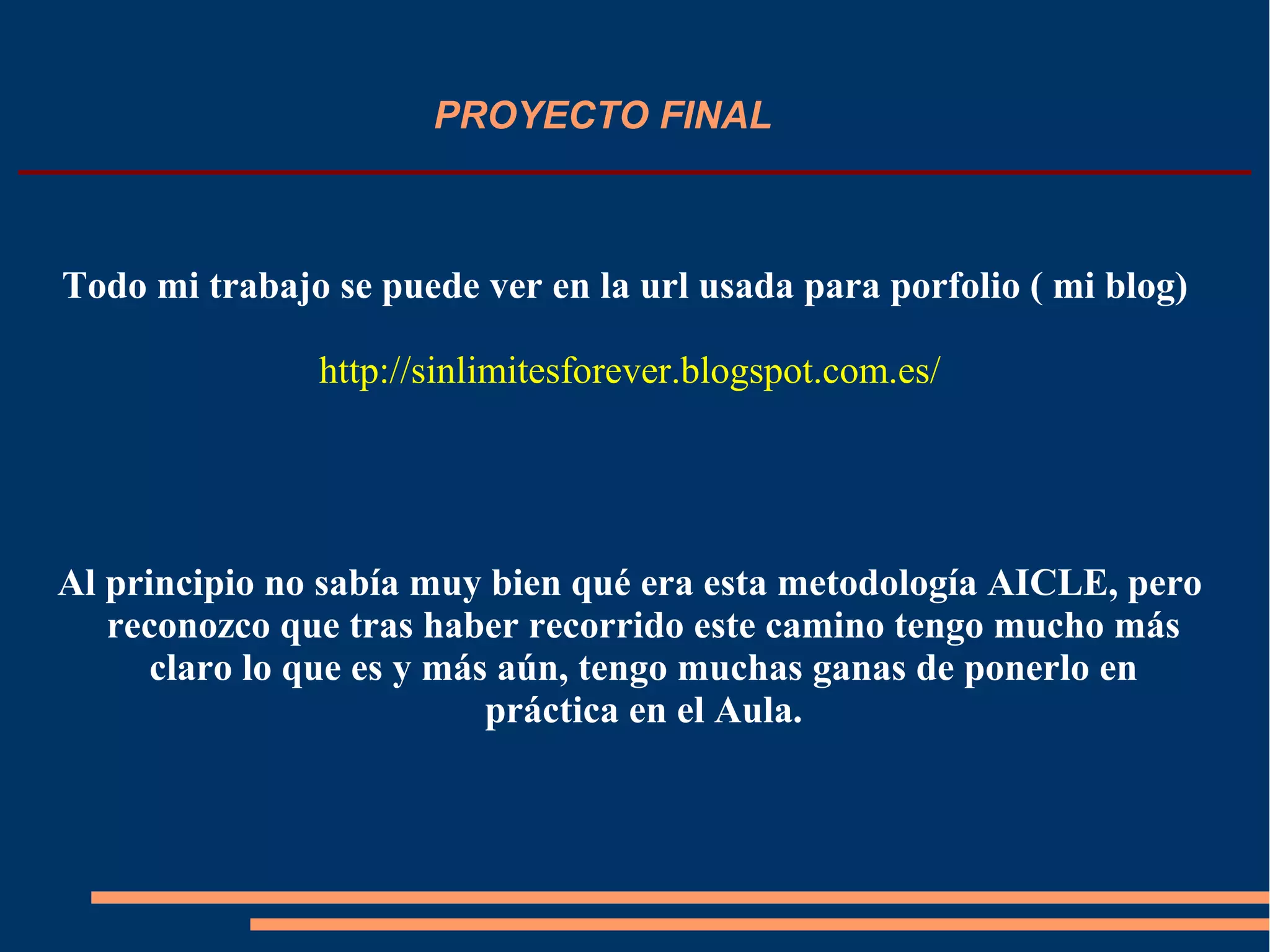 El documento describe el proyecto final de un curso sobre la metodología AICLE. Incluye actividades como presentarse, crear un blog y cuenta de Twitter, compartir contenidos en línea, analizar una unidad didáctica de ejemplo, planificar su propia unidad sobre Microsoft Access, elaborar materiales usando herramientas como Symbaloo y SlideShare, y autoevaluar su unidad y evaluar las de compañeros. El documento concluye agradeciendo la oportunidad de aprender sobre esta metodología.