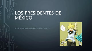 El documento proporciona una lista de 59 presidentes de México desde Guadalupe Victoria hasta Enrique Peña Nieto, incluyendo sus fechas de gobierno. Brevemente describe algunos de los logros y sucesos más importantes durante las presidencias de Guadalupe Victoria, Vicente Guerrero, José María Bocanegra, Pedro Vélez, Anastasio Bustamante y Melchor Múzquiz.