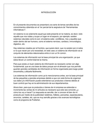 Este documento presenta información sobre sistemas de información. Explica que un sistema de información es el conjunto de elementos relacionados que recolectan, procesan, almacenan y distribuyen información para apoyar la toma de decisiones. Describe tres tipos de sistemas de información - transaccional, estratégico y de apoyo a la toma de decisiones. También resume los componentes clave de un sistema de información como las bases de datos y las publicaciones electrónicas.