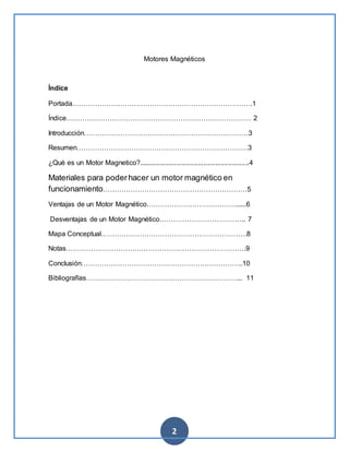 Este documento describe los motores magnéticos, incluyendo su definición, materiales necesarios, ventajas y desventajas. Explica que un motor magnético convierte la fuerza magnética en movimiento mecánico rotativo sin necesidad de otra fuente de energía. Aunque prometedores, los motores magnéticos actuales no pueden reemplazar a los motores convencionales debido a su baja potencia.
