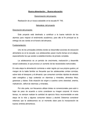 Este proyecto busca mejorar la nutrición de los estudiantes de la Escuela Técnica N° 749 a través de la implementación de un kiosco saludable que ofrezca viandas durante el horario de almuerzo. Se realizarán encuestas sobre los hábitos alimenticios de los estudiantes, folletos informativos, charlas nutricionales y conferencias de prensa con deportistas para promover una alimentación balanceada. El proyecto se llevará a cabo durante todo el año escolar con un presupuesto de $35.