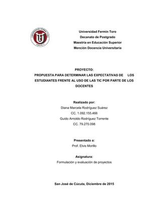 Este documento presenta una propuesta para determinar las expectativas de los estudiantes frente al uso de las tecnologías de la información y la comunicación (TIC) por parte de los docentes. La propuesta consiste en aplicar encuestas a estudiantes de colegios públicos y privados para identificar qué esperan los estudiantes en términos del uso de recursos digitales por sus profesores. Los resultados se compartirán con los docentes para mejorar la percepción de los estudiantes y fortalecer el uso de las TIC en la enseñanza.