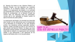 El documento divide el derecho en público y privado. El derecho público regula la organización del estado y sus funciones, mientras que el derecho privado rige las relaciones entre particulares. Dentro del derecho público se encuentran disciplinas como el derecho constitucional, administrativo, procesal, penal, de trabajo, agrario, fiscal y mercantil; y dentro del derecho privado el derecho civil y mercantil. También distingue entre derecho interno y externo.