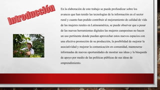 El documento discute cómo las tecnologías de la información podrían mejorar la calidad de vida de las mujeres rurales en América Latina al permitirles promover mejor su producción y conectarse con nuevas oportunidades. Sin embargo, las mujeres rurales actualmente no aprovechan plenamente estas herramientas debido a barreras para acceder a la tecnología. El documento propone diseñar un programa de capacitación en TIC para las mujeres rurales que les enseñe a usar nuevas tecnologías y aplicarlas a sus proyectos productivos.