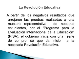 El documento discute cómo las pruebas PISA mostraron resultados negativos para los estudiantes en el país, lo que llevó al gobierno a iniciar una revolución educativa. Explica que los maestros deben usar la tecnología para enseñar a los estudiantes, quienes han nacido en la era digital, y aprovechar herramientas tecnológicas para impartir clases de manera dinámica y fomentar la participación de los estudiantes.